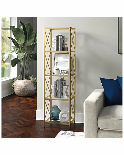 - This open 66in high bookcase is crafted in sturdy, metal and features 4-tiers of shelving to allow plenty of storage for your books, pictures, plants and more. Geometric designs along the sides of the bookcase bring a modern flair to this piece. Its compact footprint makes this the perfect storage solution for a tight corner or smaller space.