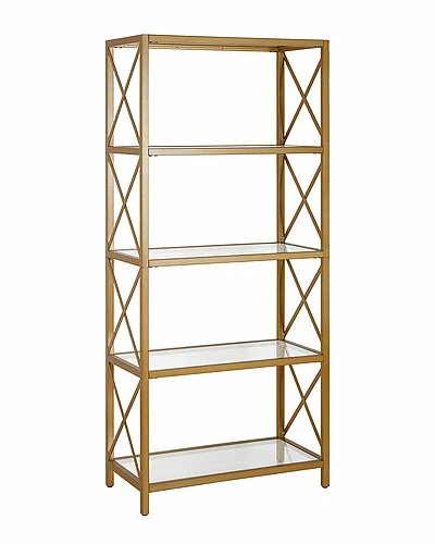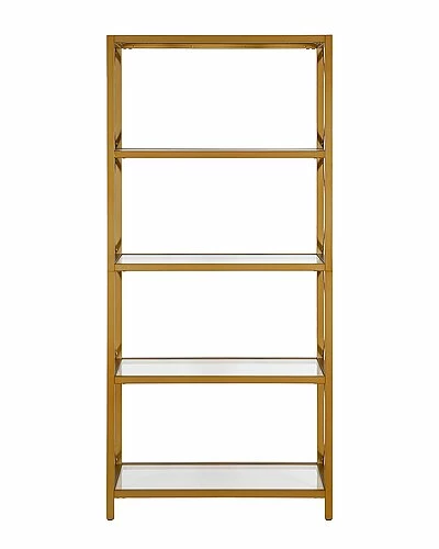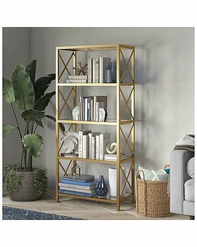 - This open 66″ high bookcase is crafted in sturdy, metal and features 4-tiers of shelving to allow plenty of storage for your books, pictures, plants and more. Geometric designs along the sides of the bookcase bring a modern flair to this piece.