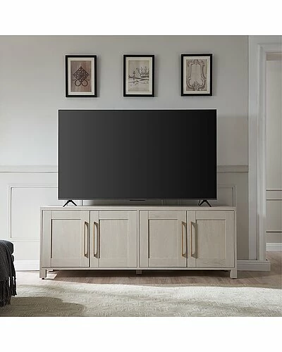 - Combine functionality and classic transitional design with this modern TV stand. Its rich wood tone creates a warm neutral palette that will blend seamlessly into any color scheme, while its classic styling pairs perfectly with the existing design inspiration of your living room, den, or game room. This solid-backed stand features two large enclosed cabinets with sleek brass-finished hardware. Cable management cut-outs and adjustable inner shelves help keep your media storage and consoles organized.