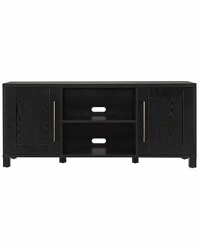 - Combine functionality and classic transitional design with this modern TV stand. Its rich wood tone creates a warm neutral palette that will blend seamlessly into any color scheme, while its classic styling pairs perfectly with the existing design inspiration of your living room, den, or game room. This solid-backed stand features two large enclosed cabinets with sleek brass-finished hardware. Cable management cut-outs and adjustable inner shelves help keep your media storage and consoles organized.