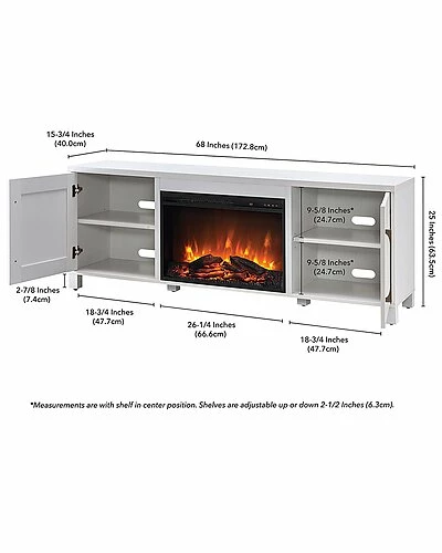 - Features an electric fireplace with LED faux-flames, with 4 shelves and 2 enclosed doors for ample storage.