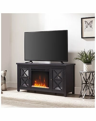 - Combine functionality and on-trend design with this sturdy TV stand, featuring an inset electric fireplace. Its rich wood tone creates a warm neutral palette that will blend seamlessly into any color scheme, while its crisscross-accented cabinet doors add a touch of modern farmhouse whimsy. Stay warm and cozy while you take in the big game, a movie marathon, or that season finale everyones been talking about.