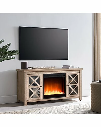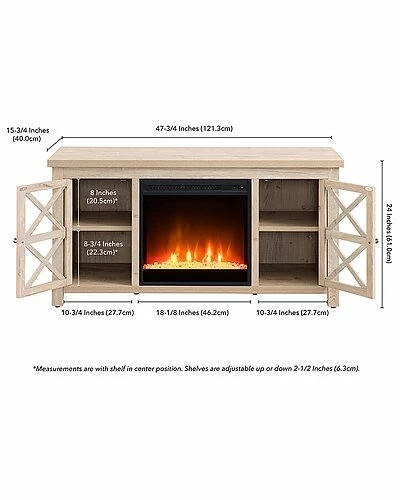 - Combine functionality and on-trend design with this sturdy TV stand, featuring an inset electric fireplace. Its rich wood tone creates a warm neutral palette that will blend seamlessly into any color scheme, while its crisscross-accented cabinet doors add a touch of modern farmhouse whimsy. Stay warm and cozy while you take in the big game, a movie marathon, or that season finale everyones been talking about.