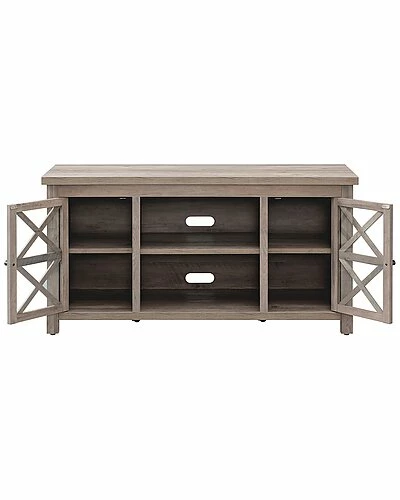 - Combine functionality and on-trend design with this sturdy TV stand. Its rich wood tone creates a warm neutral palette that will blend seamlessly into any color scheme, while its crisscross-accented cabinet doors add a touch of modern farmhouse whimsy. A must-have for living areas and entertainment spaces, this TV stand sets the stage for the big game, a movie marathon, or that season finale everyones been talking about.
