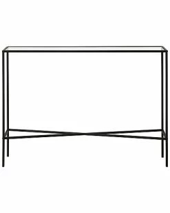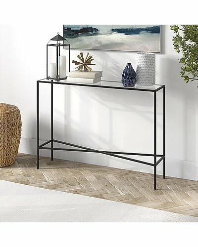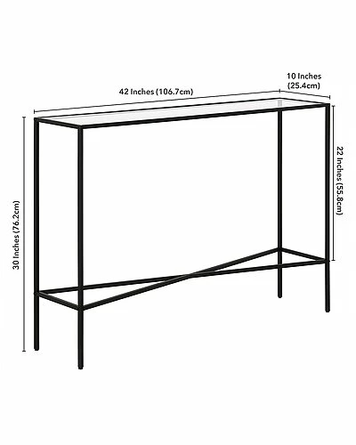 - Made of steel and durable tempered glass, this console table makes a modern, industrial-inspired addition to any living area. The clean lines of the tabletop and frame are offset by the geometric crossbar, creating visual interest without weighing down the look. With a neutral metallic finish and streamlined design, it’s easy to incorporate into a variety of styles and spaces.