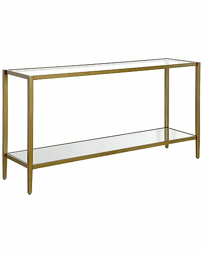 - Modern and simple, this mirrored accent table is perfect for a living room or entryway. The 55in wide table is finished in a neutral metallic finish with a clear glass top and mirrored shelf. Whether tucked behind the sofa or a display for a menagerie of trinkets, this piece is the perfect backdrop to create a magazine-ready display.