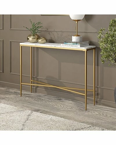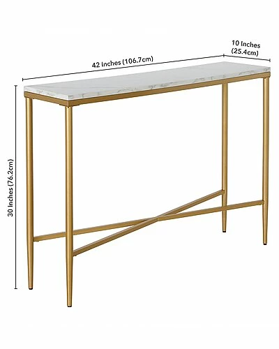 - With a durable steel frame and eye-catching faux marble tabletop, this console table makes a mid-century, yet modern, addition to any living area. The clean lines of the tabletop and frame are offset by the geometric crossbar, creating visual interest without weighing down the look. With a neutral metallic finish and streamlined design, it’s easy to incorporate into a variety of styles and spaces.