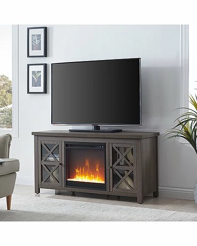 - Combine functionality and on-trend design with this sturdy TV stand, featuring an inset electric fireplace. Its rich wood tone creates a warm neutral palette that will blend seamlessly into any color scheme, while its crisscross-accented cabinet doors add a touch of modern farmhouse whimsy. Stay warm and cozy while you take in the big game, a movie marathon, or that season finale everyones been talking about.