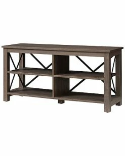 - Strong geometric lines set this modern farmhouse-inspired TV stand apart. Its X-shaped black metal accents offset the rich wood tone, creating a warm neutral color palette that will blend seamlessly into any design scheme. A must-have for living areas and entertainment spaces, this TV stand sets the stage for the big game, a movie marathon, or that season finale everyones been talking about.