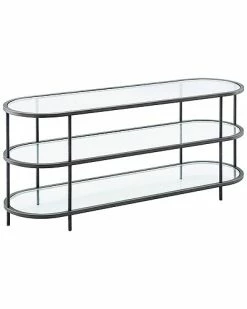 - Combine functionality and on-trend design with this eye-catching oval TV stand. Its curved tempered glass top and shelves are offset by your choice of neutral metallic finishes. The clean lines of its steel frame instantly update your entertainment space, pairing perfectly with your modern living room or mid-century den.