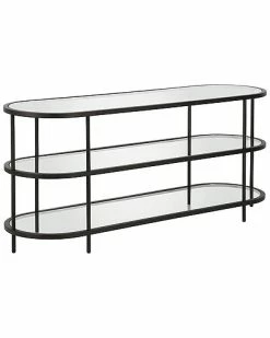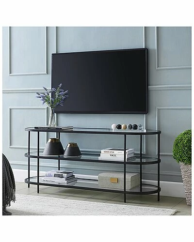 - Combine functionality and on-trend design with this eye-catching oval TV stand. Its curved tempered glass top and shelves are offset by your choice of neutral metallic finishes. The clean lines of its steel frame instantly update your entertainment space, pairing perfectly with your modern living room or mid-century den.