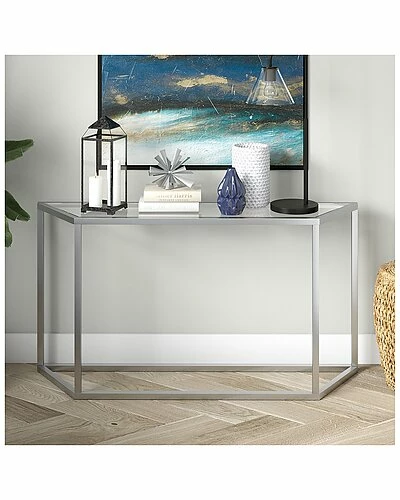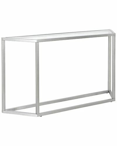 - Bring streamlined design to your living room or entryway with this modern console table. Crafted of steel in a metallic finish, this console table features a framed base and tapered rectangular silhouette. The glass tabletop provides a perfect platform for framed photos or a pair of stylish lamps.