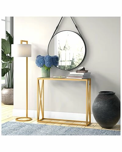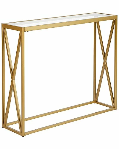 - Featuring modern geometic sides, this console table is the perfect addition to your living room or entryway. The glass table top can hold up to 40lbs and will welcome any guest with the beautiful view offlowers, your favorite photos and any other trinket you choose.