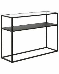 - Bring streamlined design to your living room or entryway with this modern console table. Crafted of steel in a metallic finish, this console table features a two-tiered rectangular silhouette with a solid metal shelf perfect for storing mail, keys, knicknacks and more. The glass tabletop provides a perfect platform for framed photos or a pair of stylish lamps.
