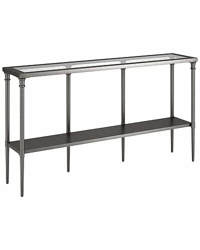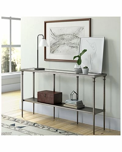 - Bring streamlined design to your living room or entryway with this modern console table. Crafted of steel in a metallic finish, this console table features a two-tiered rectangular silhouette with a solid metal shelf perfect for storing mail, keys, knicknacks and more. The glass tabletop provides a perfect platform for framed photos or a pair of stylish lamps.