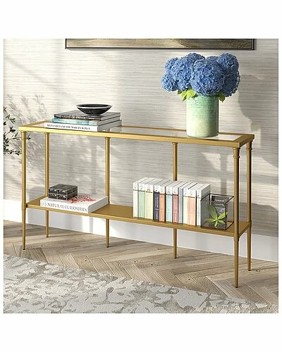 - Bring streamlined design to your living room or entryway with this modern console table. Crafted of steel in a metallic finish, this console table features a two-tiered rectangular silhouette with a solid metal shelf perfect for storing mail, keys, knicknacks and more. The glass tabletop provides a perfect platform for framed photos or a pair of stylish lamps.