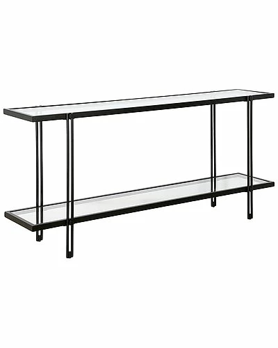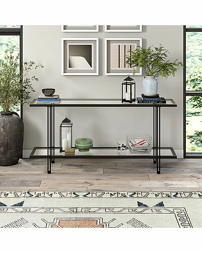 - Complete your hallway or living room ensemble in modern style with this contemporary console table. Crafted of premium steel hand-crafted in a brass finish, this sofa or entryway table features a clean-lined rectangular silhouette on four straight legs. The open lower glass shelf is great for housing books, magazines, and extra belongings.