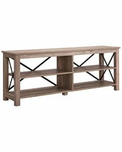 - Strong geometric lines set this modern farmhouse-inspired TV stand apart. Its X-shaped black metal accents offset the rich wood tone, creating a warm neutral color palette that will blend seamlessly into any design scheme. A must-have for living areas and entertainment spaces, this TV stand sets the stage for the big game, a movie marathon, or that season finale everyones been talking about.