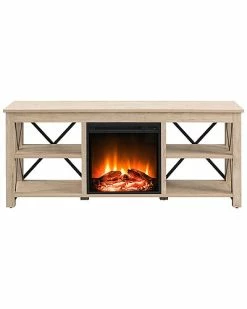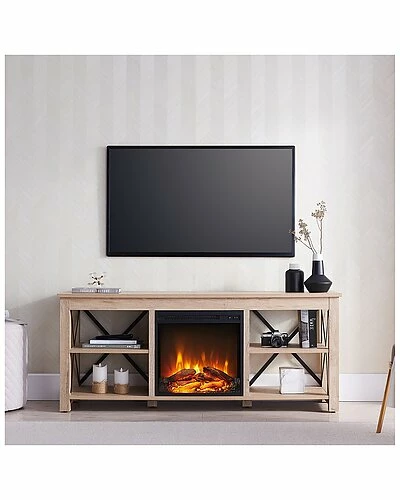 - Strong geometric lines and an inset electric fireplace set this modern farmhouse-inspired TV stand apart. Its X-shaped black metal accents offset the rich wood tone, creating a warm neutral color palette that will blend seamlessly into any design scheme. Stay warm and cozy while you take in the big game, a movie marathon, or that season finale everyones been talking about.