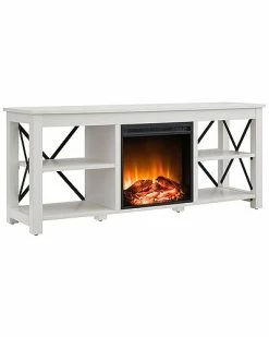 - Strong geometric lines and an inset electric fireplace set this modern farmhouse-inspired TV stand apart. Its X-shaped black metal accents offset the rich wood tone, creating a warm neutral color palette that will blend seamlessly into any design scheme. Stay warm and cozy while you take in the big game, a movie marathon, or that season finale everyones been talking about.