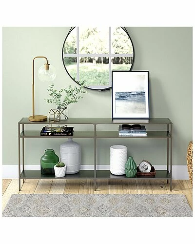 - This modern industrial console table combines design with function. Create a warm welcome with the clean lines of this 64in console table. Whether tucked behind the sofa or a display for a menagerie of trinkets, this console table is the perfect backdrop to create a magazine-ready display.