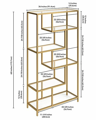 - Combine functionality and on-trend design with this eye-catching and versatile bookcase. The clean lines of its steel frame instantly update any storage space, pairing perfectly with your modern home office or mid-century den. Its compact footprint makes this the perfect storage space if youre worKing: with a tight corner or smaller space. The geometric, staggered shelving is made of durable tempered glass, creating plenty of storage without weighing down the room visually. The four tiers allow you optimal space to display your books, pictures frames, plants and more!