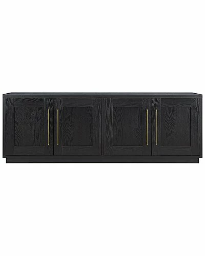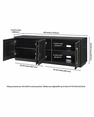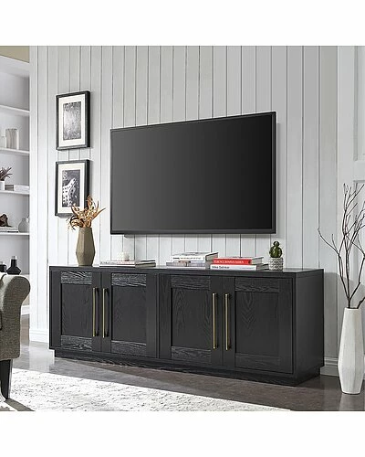 - Combine functionality and classic transitional design with this modern TV stand. Its rich wood tone creates a warm neutral palette that will blend seamlessly into any color scheme, while its classic styling pairs perfectly with the existing design inspiration of your living room, den, or game room. This solid-backed stand features two large enclosed cabinets with sleek brass-finished hardware. Cable management cut-outs and adjustable inner shelves help keep your media storage and consoles organized.