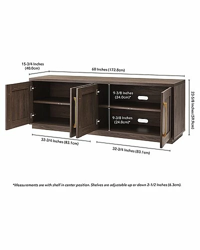 - Combine functionality and classic transitional design with this modern TV stand. Its rich wood tone creates a warm neutral palette that will blend seamlessly into any color scheme, while its classic styling pairs perfectly with the existing design inspiration of your living room, den, or game room. This solid-backed stand features two large enclosed cabinets with sleek brass-finished hardware. Cable management cut-outs and adjustable inner shelves help keep your media storage and consoles organized.