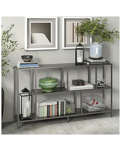 - Clean, minimalist lines and sturdy tempered glass make this console table the perfect addition to your living room, bedroom or entryway. Proudly display knick-knacks, magazines and more on the durable steel top and staggered lower shelves. The streamlined look and neutral metallic finish pairs seamlessly with your existing color scheme and decor style.