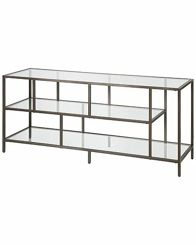 - A must-have for living areas and entertainment spaces, this TV stand sets the stage for the big game, a movie marathon, or that season finale everyones been talking about. Crafted from steel, it strikes a clean-lined silhouette and boasts an aged steel finish paired with glass shelves for a look that blends with nearly any color palette.