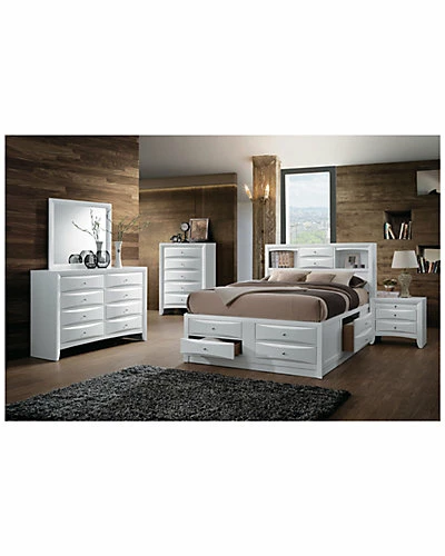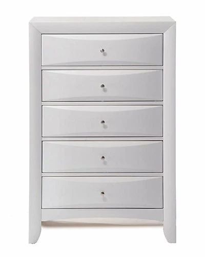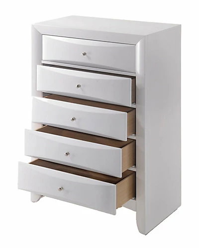 - The Ireland chest comes with five spacious drawers, perfect for all your foldable clothes from socks to sweaters. Each drawer features an English dovetail design with center metal glides. Selected solid wood and engineered wood construct the frame, topped by wood veneers. A white finish completes the look. The drawer faces boast beveled tops and bottoms, equipped with nickel-finished metal knob.