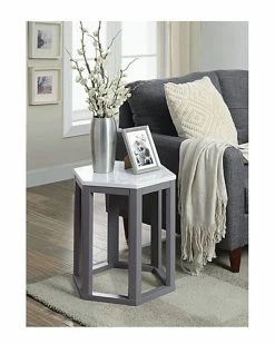- Redefine your space with a modern look and industrial styling with the Reon End Table. This hexagon shaped end table features a magnificent marble top resting on a sturdy open wood base, showcasing a distinctive style for an intriguing look. This beautiful accent table will modernize any space you place it.