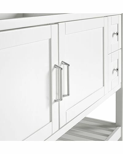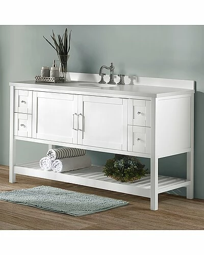 - This freestanding vanity base has a classic look and ample storage for your bathroom or powder room. It’s made from solid pine wood and composite wood. This base features two paneled shaker doors and four drawers with nickel handles for you to store cleaning supplies and other bathroom essentials. An open, slatted bottom shelf offers additional room for bath towels. The clean white finish complements a wide range of decors . Vanity top and sink are not included. Overall Dimensions: 60in W x 21 1/4in D x 34in HSlatted shelf dimensions: 57inW x 18inD x 9.5inHInterior cabinet dimensions: 39in W x 19 3/8in D x 17 1/2in HDrawer dimensions: 5 3/4inW x 15 3/4inD x 5inHSoft-close doors and drawers, nickel hardware, adjustable height levelersFree standing vanity is seated on the floor providing a functional design that doesn’t overwhelm the space; Distance from floor to bottom shelf: 3 1/2inFaucets, sinks, and countertop not included
