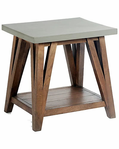 - Decorate your living space with this new innovative construction. Modern, industrial Concrete-coated-topped table with solid wood base and shelf will offer a fresh new look to your living room. We see this collection in a modern city loft or a transitional living room that needs just a pop of updated style..Concrete-coated table top, providing a modern farmhouse look.Unique detailed legs.Coordinates with many decorating styles.Collection includes end tables, coffee tables, console.media tables, dining.entryway bench, stool and entryway coat hook.Mango Wood base with lacquer finish.Extra shelf included for extra display.Shelf is not adjustable.Hardware and all tools included.Overall Dimensions: 22in W x 18in D x 22in H.Tabletop Thickness: 15in.