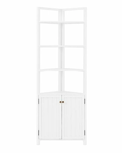 - This collection brings space saving storage to your bathroom. The classic design compliments almost any bathroom decor. Wood construction with a white, painted finish, these pieces are designed for both style and functionality. Store toiletries, stacked washcloths, rolled towels or anything you need to keep organized. This 25in wide corner storage cabinet features four fixed shelves above the cabinet and two adjustable shelves inside the cabinet. Bath collection is moisture resistant.