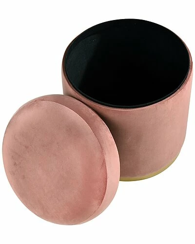 - The Raina Storage Ottoman has a drum shape and a brass metal band around its base. A small ridge at the top of the velvet upholstery reveals an inner storage area. Every room benefits from a chic velvet storage piece like this ottoman, which doubles as a side table or extra seating.