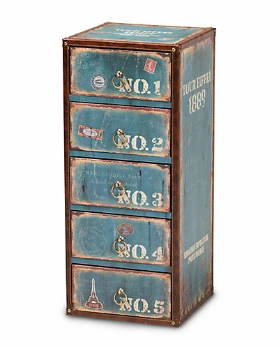 - Bring a piece of Paris into your home with the travel inspired Alba chest. Decorated in weathered colors, text, and stamps, this piece holds a look certain to remind anyone of their travels to, or love for, Paris, France. The Alba is made in China and contains five drawers, each fitted with brass metal ring pulls, to serve as the perfect place for souvenirs or other items. Distinctive faux leather bands, studded with gold-tone stitching and pins, line the angles of the Alba to add to its wonderful travel aesthetic. The Alba will arrive fully assembled and goes beyond the mundane by bringing a piece of Paris into your home. Dimensions: 28.3″ high x 11.8″ wide x 11.8″ deep; Drawer dimensions: 4.3″ high x 10.4″ wide x 11.8″ deep.