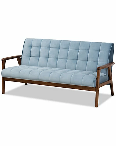 - Design details: Declare your allegiance to timelessness with the Asta living room set. Constructed from solid rubberwood, the Asta set includes one sofa and two chairs. Each piece is upholstered a soft, sumptuous light blue velvet fabric that complements the walnut brown finish on the wood. Wide, plush cushions provide ample seating comfort, while biscuit tufting and angled legs lend a cool, retro look. Stylish and versatile, this set is well suited for both private living spaces and public reception areas. The Asta living room set is made in Malaysia and requires assembly. Sofa