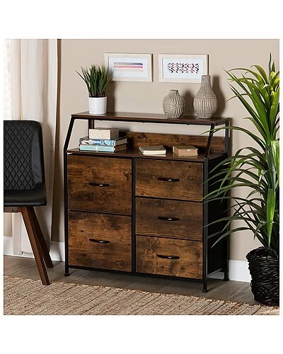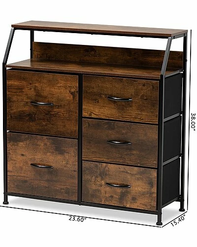 - The versatile Jacop storage cabinet expands the capabilities of your home. Made in China, this cabinet is comprised of a solid metal frame fitted with sturdy wood shelves and fabric upholstered drawers. The open shelf and wide tabletop create an eye-catching display for home decorations while five drawers offer storage to organize and declutter your interior. Requiring assembly, the Jacop is adorned with curved drawer handles for a sleek, industrial touch. A stunning rendition of modern industrial design, the Jacop storage cabinet is sure to leave an impression. Overall Dimensions: 38.00″ High x 23.60″ Wide x 15.40″ Deep; Drawer Dimension: 22.00″ Wide x 15.00″ Deep x 8.50″ High; Open Storage Dimension: 21.90″ Wide x 14.90″ Deep x 8.40″ High;