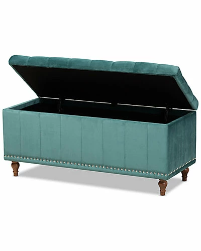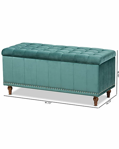 - Design details: Whether placed in the bedroom or living room, the Kaylee storage bench offers elegant style and handy storage space. Constructed from rubberwood, the Kaylee is upholstered in a soft velvet fabric that adds a dose of glamour to your space. The top is foam padded for seating comfort and opens to reveal ample storage space for extra blankets and linens. Silver nail heads and grid stitching lend a modern look, while button tufting and turned feet add a refined elegance. The Kaylee storage bench is made in Malaysia and requires leg assembly.