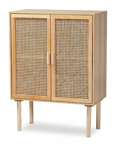 - Presenting a light, airy display, the Maclean storage cabinet accommodates your storage needs. this cabinet is crafted from sturdy wood and accented with natural rattan. Two large shelves behind the doors provide ample space to organize and declutter busy areas of your home. Requiring assembly, the Maclean is supported by rod like legs for a unique outline that exudes charm. A superb upgrade to any interior layout, the Maclean storage cabinet is a delightful addition to the modern home. Overall Dimensions: 43.30in High x 31.50in Wide x 15.70in Deep; Storage Behind Door Dimensions: 30.50in Wide x 14.90in Deep x 30.60in High; Legs: 11.20in High;