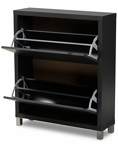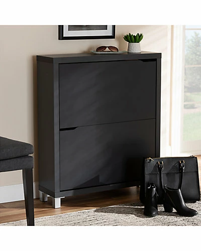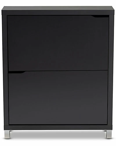 - Design details: The solution to stylish shoe organization lies within the Simms shoe cabinet. This modern cabinet was designed with a low profile to fit neatly against a wall in a hallway, mud room, or entryway. Two fold-out storage compartments provide space to place up to 12 pairs of shoes. Silver plastic legs add refined style and provide elevation to deter dust buildup. Constructed from engineered wood, the Simms showcases a sleek dark grey finish that complements modern interiors. The Simms shoe cabinet is made in Malaysia and requires assembly.