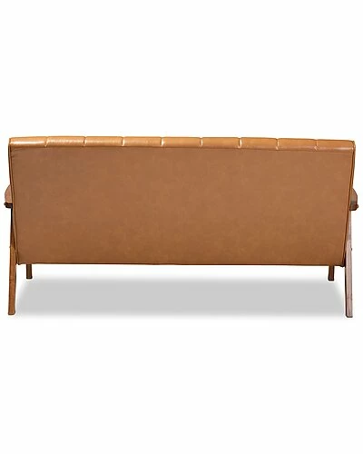 - The Nikko sofa is a stunning and eye-catching piece perfect for adding personality to any space. the Nikko is constructed from sturdy wood padded with soft foam and upholstered in smooth, tan-colored faux leather. The angular frame showcases warm walnut tones and features long legs that form ergonomic armrests. Requiring assembly, sleek channel tufting provides unique visual charm while ensuring plush comfort that lasts. With a nod to mid-century design, the Nikko sofa is an ideal accent piece for the modern home. Dimensions: 31.9″ High x 64″ Wide x 29.7″ Deep; Seating Dimensions: 16.25″ High (from Floor) x59″ Wide x 21″ Deep; Back: 15.65″ High; Legs: 10″ High;