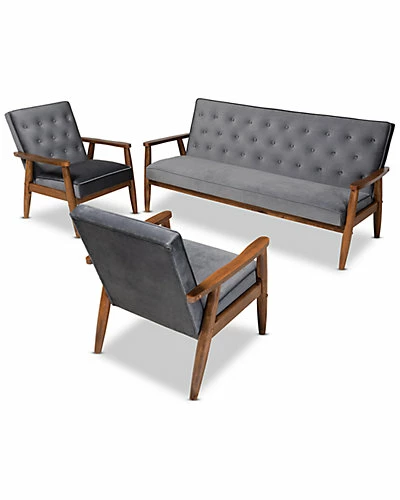 - Design details: A simple, post-modern design that works well with a variety of styles, the Sorrento living room set is upholstered in a grey velvet fabric and features sturdy rubberwood construction. The sculptural arms and wide, welcoming seats are a throwback to classic 1950s and 1960s Danish design. Splayed legs and button-tufting add a retro modern touch. The fully upholstered seats with exposed dark walnut wood look great from all angles, whether in a lounge arrangement, public waiting area or private office. The Sorrento living room set is made in Malaysia and requires assembly.