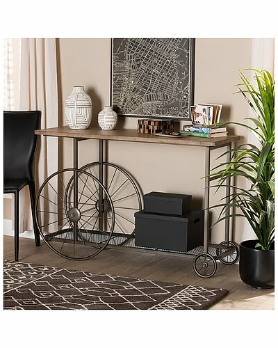- Add rustic charm to your space with the Terence console table. the Terence is comprised of a black finished metal frame fitted with a natural finished wood tabletop. A lower mesh metal shelf keeps various items on hand while organizing clutter. Requiring assembly, the Terence is fitted with decorative wheels that lend a unique, eye-catching aesthetic. Bring some vintage charisma to your space with the Terence console table. Dimensions: 30″ High x 48.6″ Wide x 15.6″ Deep; Lower Shelf:25.25″ H x 46.25″ W x 13.25″ D