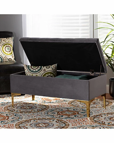 - Design details: Glamorous seating doubles as practical storage in the Valere ottoman. Constructed from oak wood, the Valere is upholstered in a lavish velvet fabric and padded with foam for the utmost sitting comfort. The elegant button tufted top opens to reveal ample storage space, while gold-tone legs add a striking look. The Valere is well suited for use as a bench in your bedroom or as an accent piece in your living room. The Valere ottoman is made in China and requires assembly.