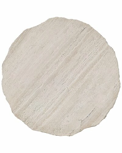 - Laminated White Travertine round stone top with chiseled edge. Solid steel base in oil-rubbed bronze finish. Adjustable glides.