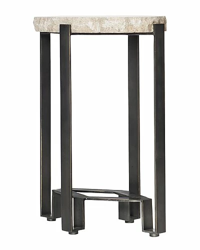 - Laminated White Travertine oval stone top with chiseled edge. Solid steel base in oil-rubbed bronze finish. Adjustable glides.