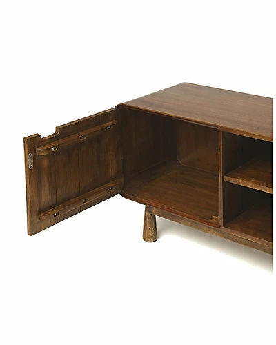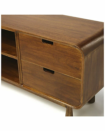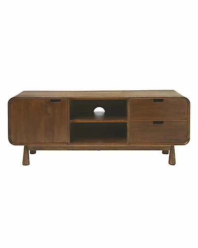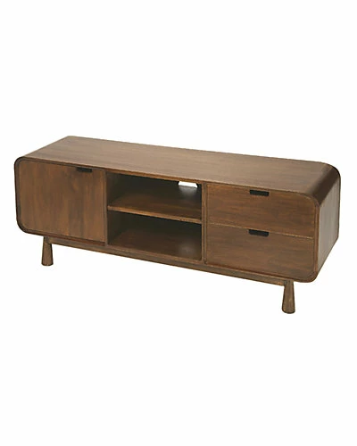 - Entertain guests with this 49.5″ W, entertainment center, a perfect blend of mid-century classic design and modern functionality. With open shelves, Storage cabinet, and two drawers to keep your favorite entertainment accessories neatly stowed away. Media holes provide wire management and keep your room looking seamless and sleek. No need to mount it to your wall, as it is free standing.