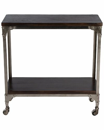 - Hand-crafted from iron and mango wood, this rustic console table on casters offers a portable option for serving guests. It offers a tabletop display and a matching lower display shelf. Its black iron frame and burnt umber wood finish are complimentary to one another.